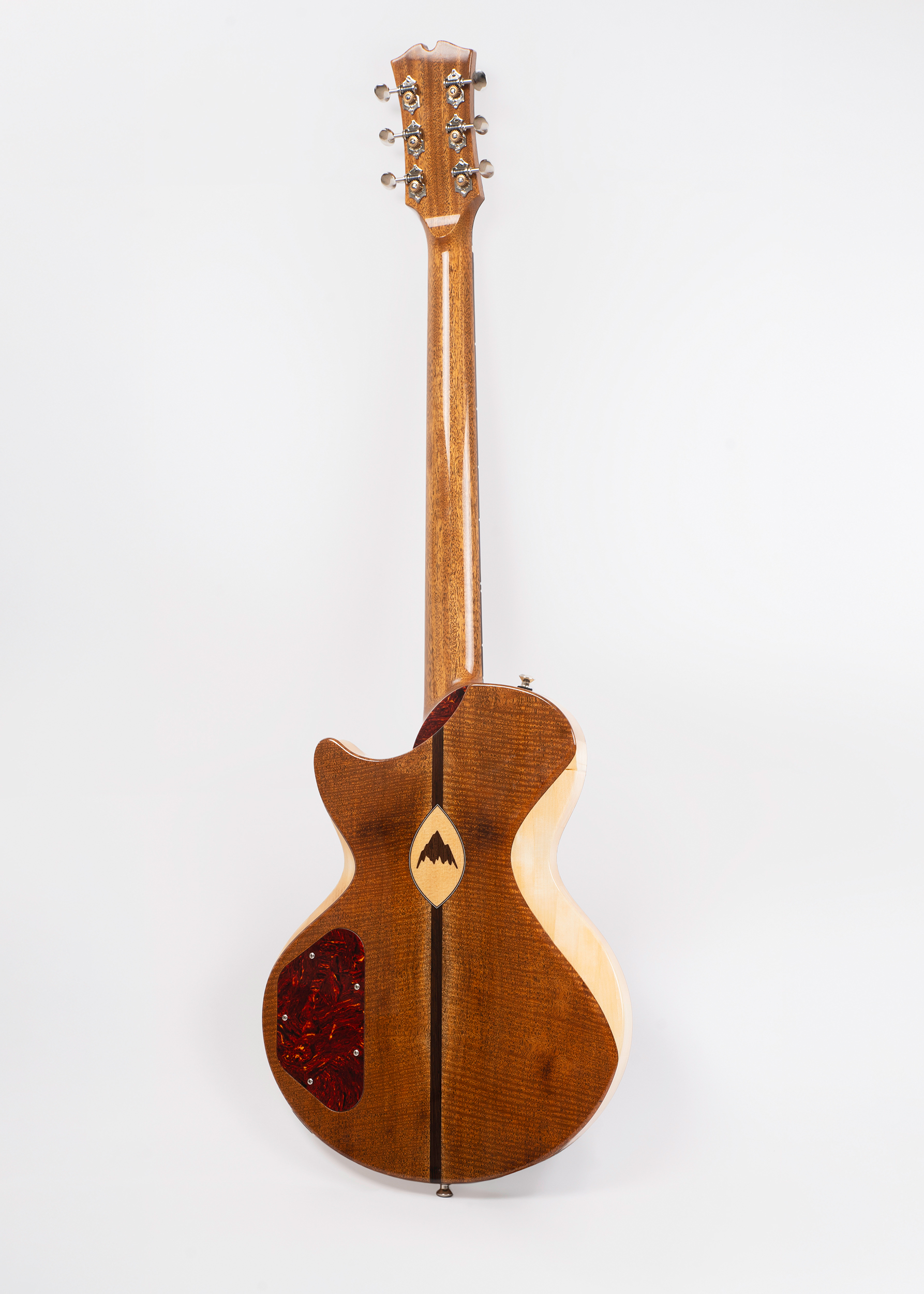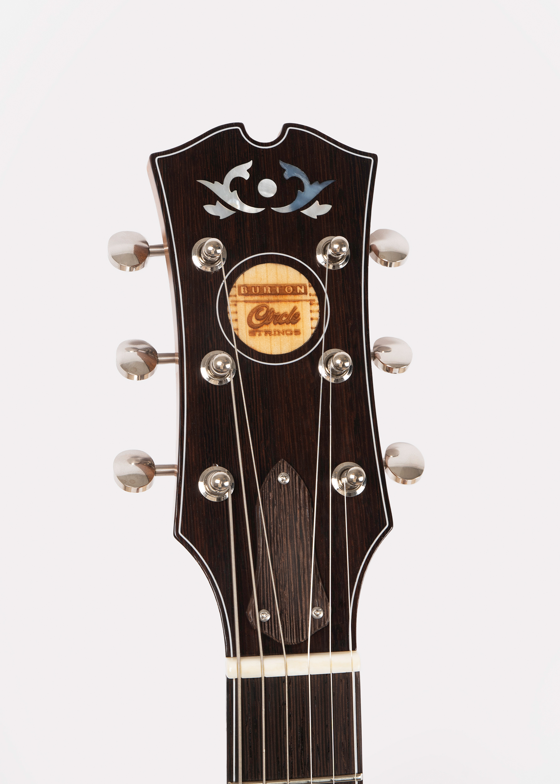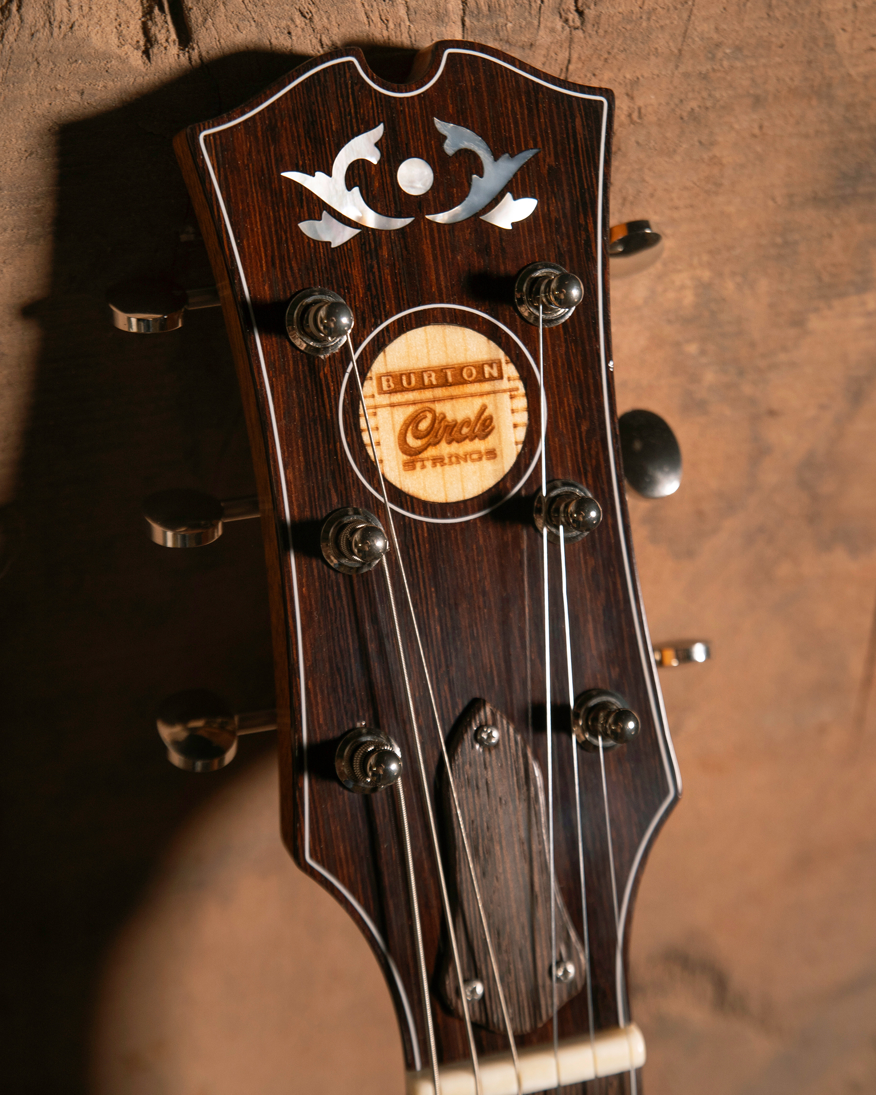 Burton’s Superfly II core forms the body of this instrument, capped with Mahogany Mama on the front and back. A natural finish exposes the core’s construction, offering a window into the materials typically hidden beneath opaque finishes.