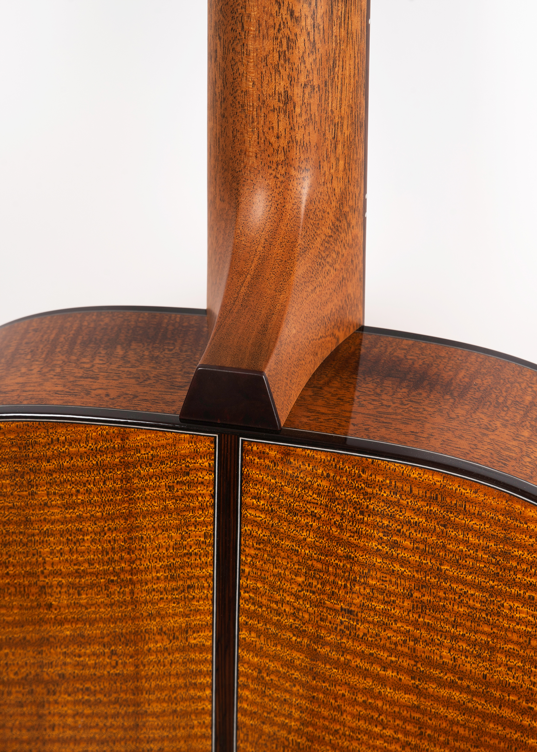 Wenge frames a center stripe of flame-figured Mahogany Mama, while a “soundhole” exposes the board’s inner core construction. Fiber purfling, matching Koa rosettes and inlaid logos connect all three pieces visually.