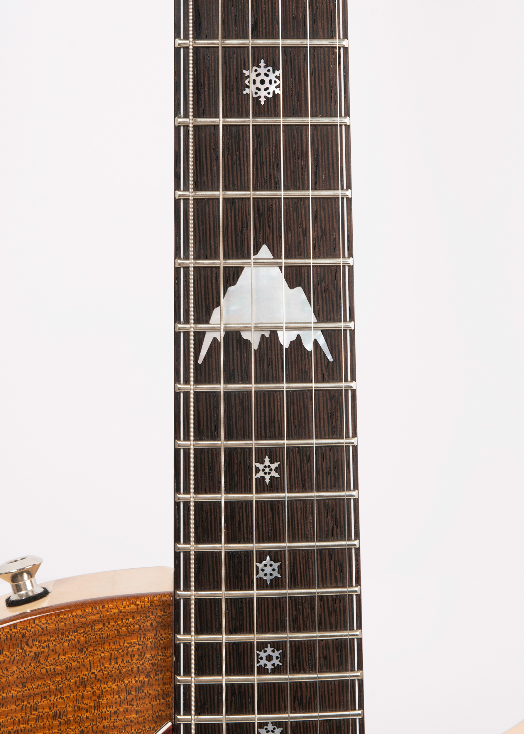 The fingerboard inlays on both the acoustic and electric guitars feature unique designs of snowflakes photographed by Bentley.